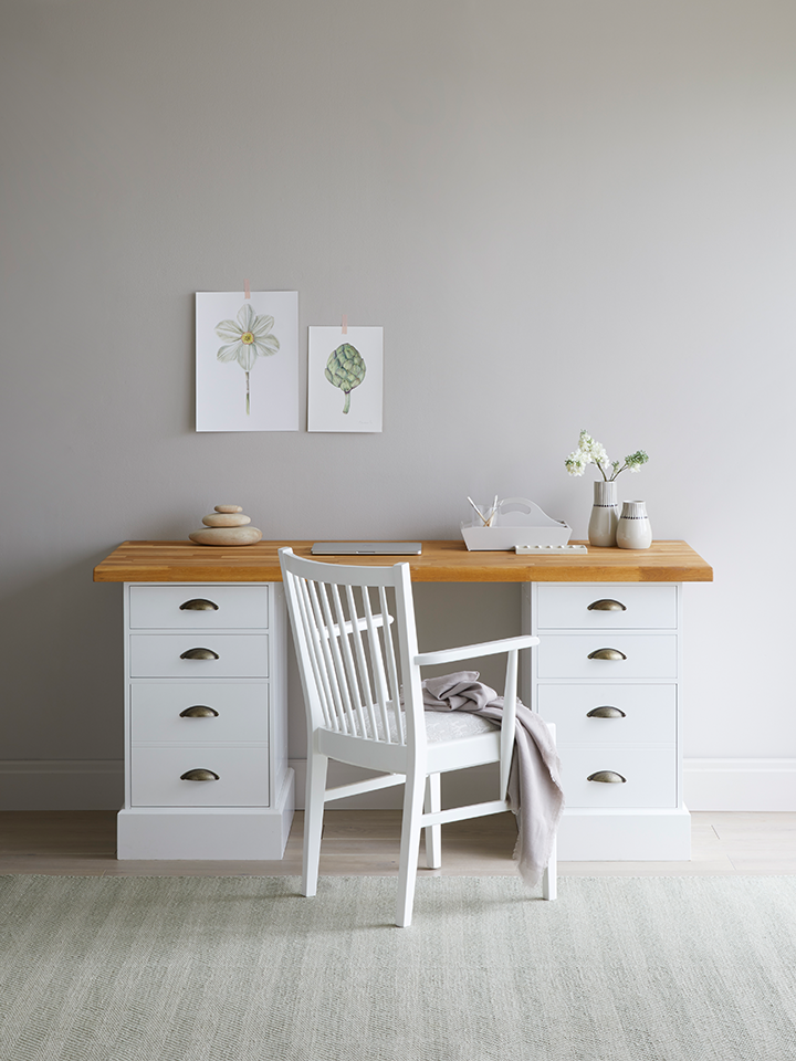 Shown here in a fresh painted finish, the desk can arrive in one of our stylish shades or in plain MDF if you prefer to decorate it together at home. Two sturdy filing pedestals support the oak top, and every drawer glides on heavy-duty full-extension runners that open effortlessly even for small hands.